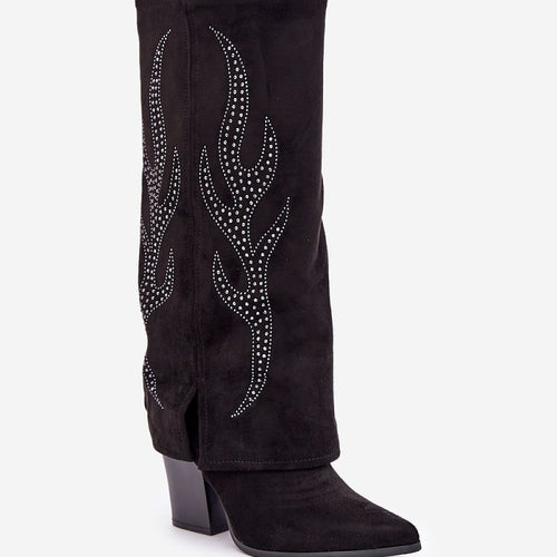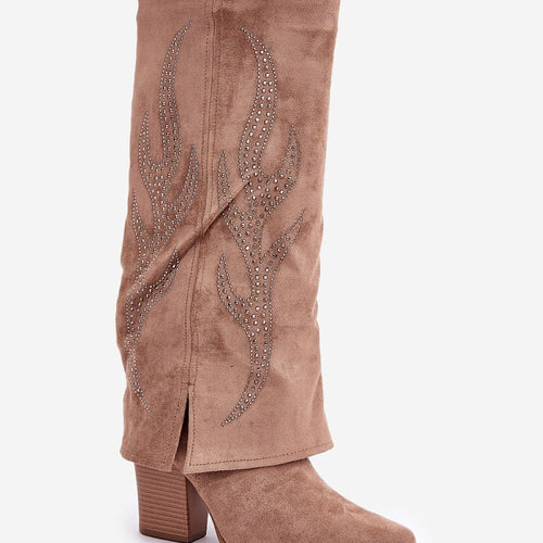 Women's boots made of eco suede. Slip-on model with an additional zip fastening at the bottom for easy putting on and taking off. Pointed toes visually slim the legs, and the folded upper with embellishment adds a unique character. Stylish and unique, perfect for trendy stylizations. fabric imitation leather suede Footbed fabric Upper height 35.5 cm Heel height 8.5 cm...
