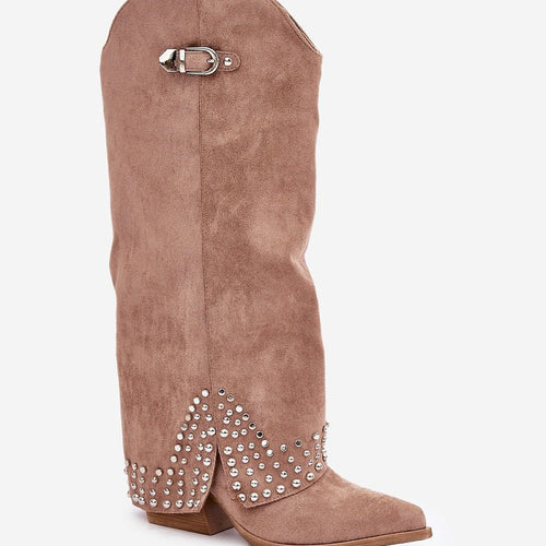 Stylish women's ankle boots made of eco suede. The model stands out with a rolled-up shaft decorated with jets and an elegant buckle. Pointed toes give the footwear elegance and emphasize its unique design. An ideal choice for women who appreciate fashion and originality in their everyday stylizations. fabric imitation leather suede warmers fabric Footbed fabric Upper height 40 cm...