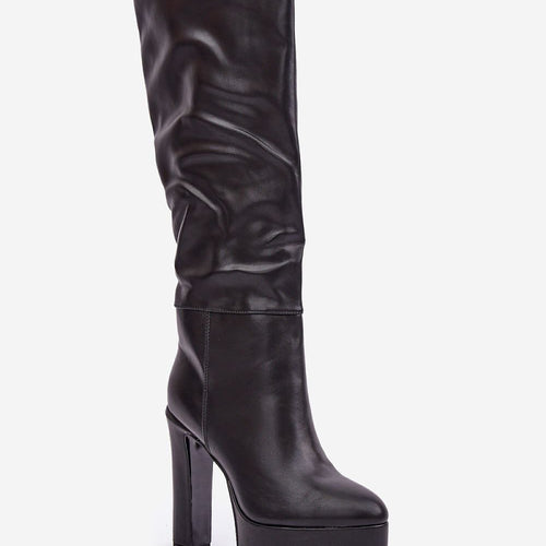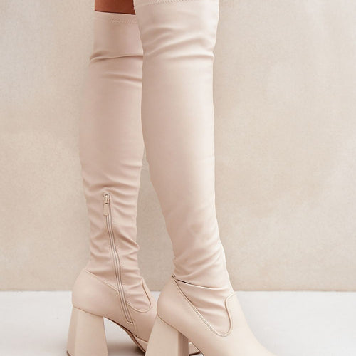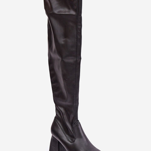 Fitted women's boots made of eco leather, which perfectly emphasize the legs. Set on a stable column heel, they provide elegance and comfort. The over-the-knee shaft adds chic, and the square toes give a modern character. Slip-on model, with an additional zipper for easy on and off. The inside is lightly lined with shoe lining. Stylish and feminine, great for...