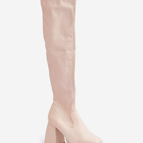 Fitted women's boots made of eco leather, which perfectly highlight the legs. Set on a stable column heel, they provide elegance and comfort. The over-the-knee shaft adds chic, and the square toes give a modern character. Slip-on model, with an additional zipper closure for easy on and off. Slightly warmed inside with a shoe blanket. Stylish and feminine, great for...