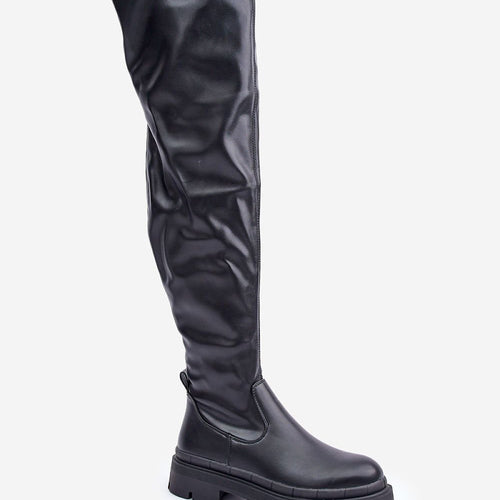 Stylish boots made of eco leather are a perfect choice for cold days. They provide comfort thanks to the flat heel, making them ideal for everyday use. This model is distinguished by rounded toes and a shaft reaching over the knee, making them perfect for dresses and skirts, adding elegance to any outfit. The interior of the shoes is only...