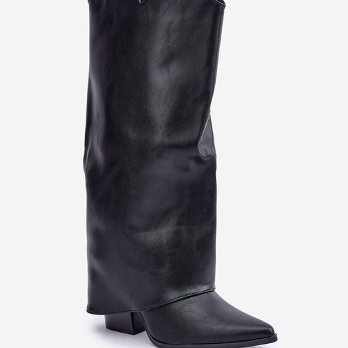 Women's eco leather boots with a folded shaft, which elegantly overlaps on the heel, are an elegant choice for cooler days. Pointed toes add slimness. Slip-on model provides easy putting on. The interior is lined with a shoe blanket, making these shoes perfect for autumn-winter stylizations, adding refined style and comfort to them. fabric artificial leather warmers shoe cover Footbed...