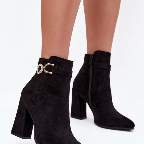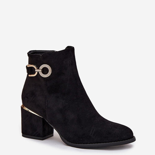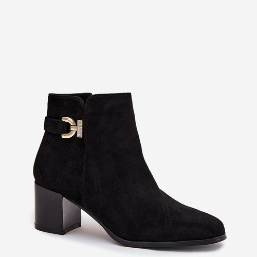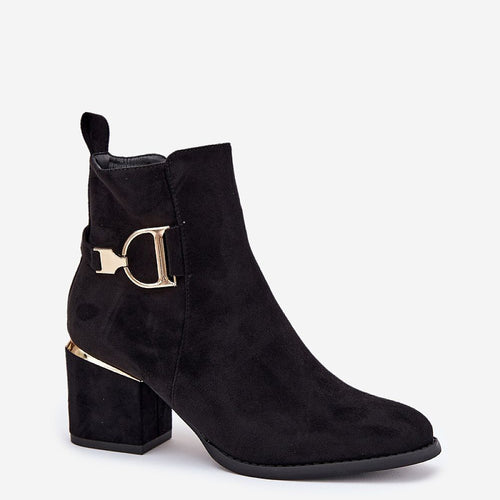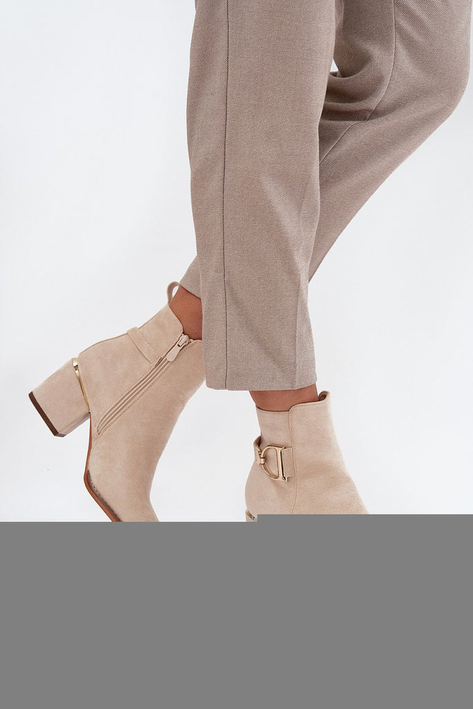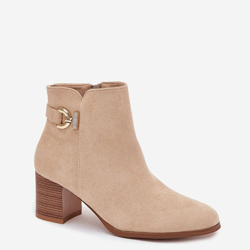 Women's ankle boots made of faux suede. Set on a column-shaped heel. Rounded toes give them a subtle, feminine character, and the zipper makes them easy to put on. The interior lined with soft shoe lining provides warmth and comfort, while the gold elements add a stylish, elegant accent that complements both casual and more formal outfits perfectly. fabric imitation...