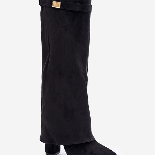 Elegant women's boots made of ecological suede. Set on a column-shaped heel. Pointed toes. A unique element of this model is the rolled-up shaft with a detachable strap at the top of the shaft, which overlaps the heel. Zipper closure. Perfect for wearing with dresses or skirts! fabric imitation leather suede Footbed fabric Upper height 40 cm Heel height 11...