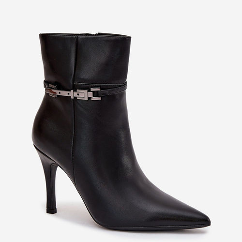 Women's ankle boots made of eco leather are an elegant proposition for cooler days. Set on a slim heel, they beautifully slim the silhouette, and pointed toes emphasize the feminine character of the shoes. The interior lined with a shoe blanket provides comfort and warmth. A stylish accent is the silver element strap placed on the upper, which adds a...