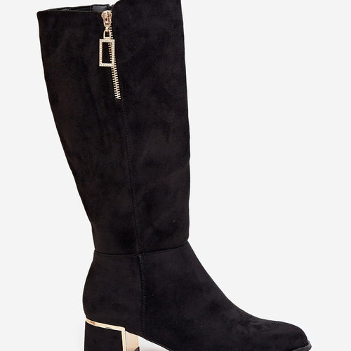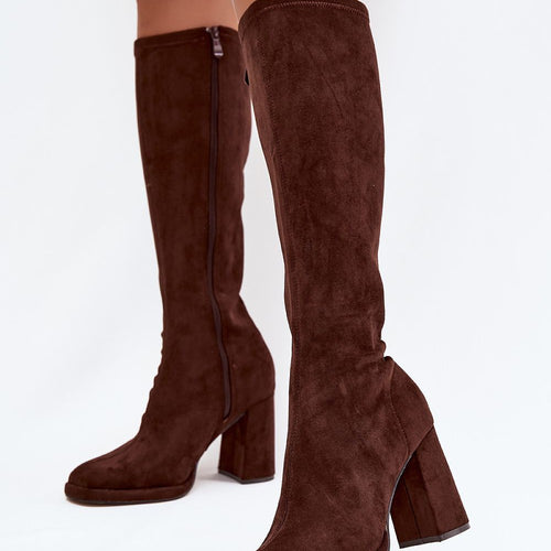 Women's boots made of soft eco suede. A stable column-shaped heel provides comfort, while gently rounded toes add a subtle character to the whole. The model fastens with a zipper. The snug upper decorated with stitching beautifully emphasizes the leg line, creating a slim and feminine silhouette. Perfect for both everyday and elegant styling with dresses and skirts. fabric imitation...
