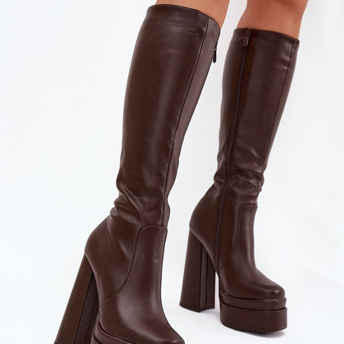 Women's boots made of synthetic leather, set on a column-shaped heel and platform. Fastened with a zipper, they provide easy on and off, and rounded toes add comfort. The knee-high shaft, along with the shoe lining insulation, provides warmth and comfort even on cooler days. These boots perfectly complement winter outfits. fabric artificial leather warmers shoe cover Footbed shoe cover...