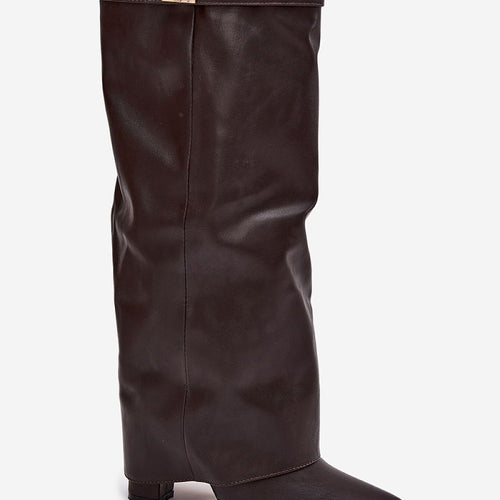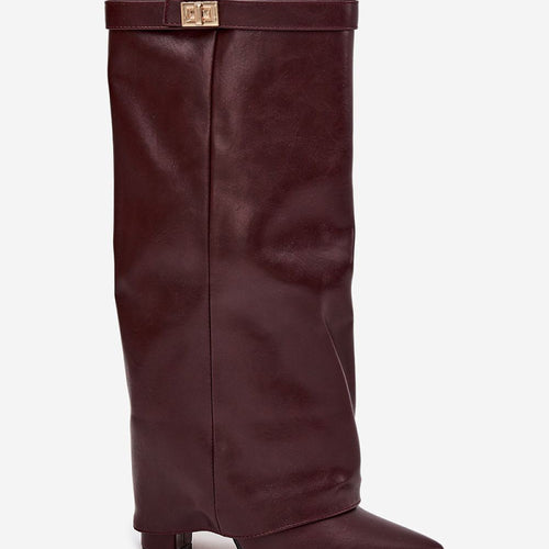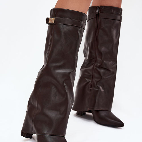 Women's knee-high boots made of eco leather are an elegant proposal for colder days. The main advantage of this model is the folded shaft decorated with a strap with a gold detail, which gives them a unique character. Pointed toes visually slim the legs, and the block heel ensures stability and comfort. Fastened with a zipper, these boots will be...