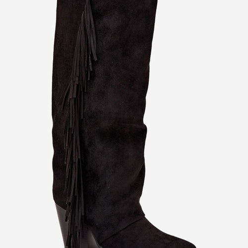 Cowboy boots for women, made of faux suede, are a fashionable proposition for many stylizations. The column-shaped heel provides comfort, and the zip closure makes it easy to put on. Pointed toes. Fringes on the side of the upper add a bit of looseness and boho character. Perfect for casual stylizations, they go great with dresses, skirts, and pants, creating...