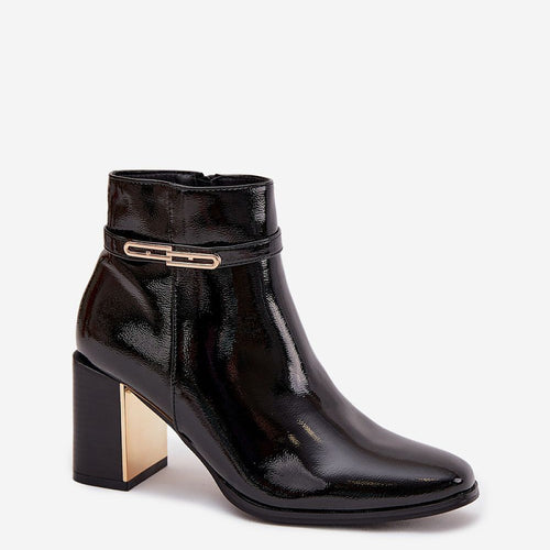 Women's ankle boots made of patent eco leather. The model is set on a stable pillar-type heel, decorated with a mirrored element, looks exceptionally stylish. The upper is decorated with a thin strap with a gold detail. The shoes are fastened with a zipper, which ensures easy putting on. The insulated interior guarantees warmth and comfort on colder days. It...