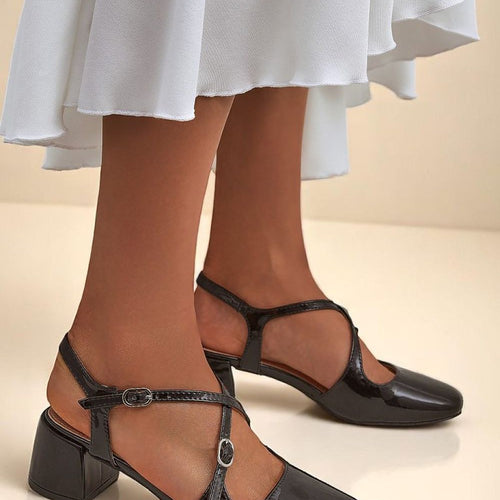 Beautiful women's low-heeled pumps with straps. The upper is made of patent eco leather, while the inside is lined with eco leather. These shoes will add elegance to any look! fabric artificial leather Footbed artificial leather Heel height 6 cm Size Insole lenght 36 23 cm 37 23.8 cm 38 24.5 cm 39 25 cm 40 25.8 cm 41 26.5...