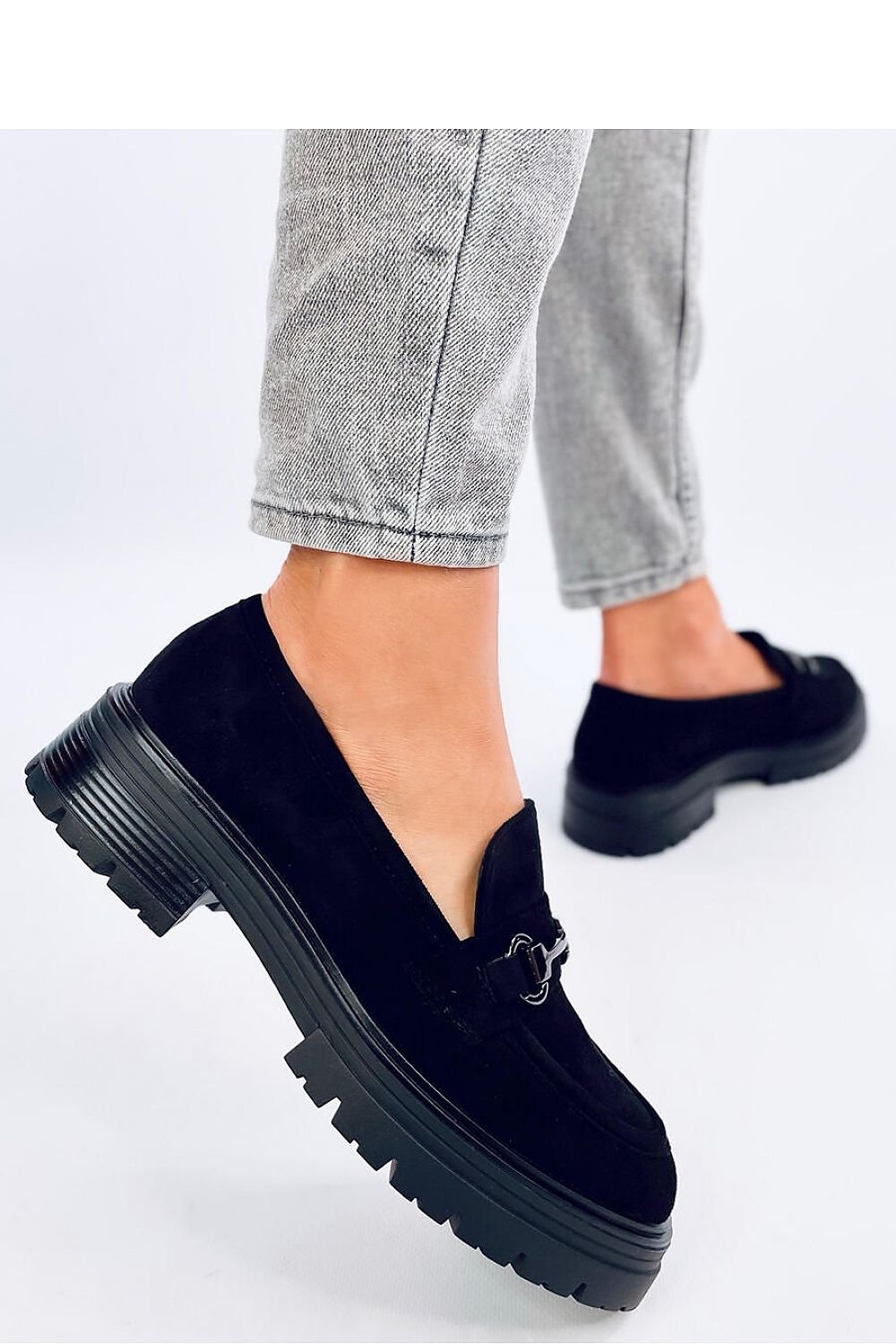 Black women's moccasins on a thick sole. The model is made of eco-suede, which, combined with a decorative buckle, looks extremely stylish. If you rely on minimalism in your styling, you've come to the right place : )
