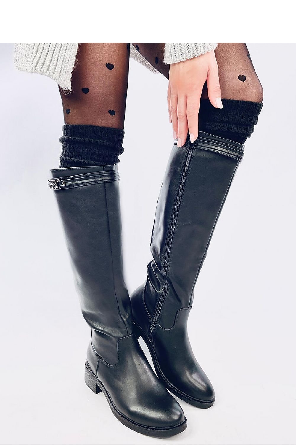 Women's veneer boots - jackboots on a flat sole. The classic design of this model is diversified by a subtle gold ornament. Through the entire length of the upper they have a practical zipper, which ensures comfortable putting on. They should be yours today! They are made of organic leather, on a foam lining.
