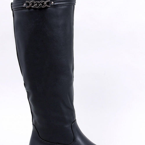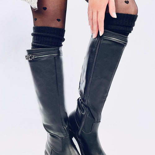 Women's veneer boots - jackboots on a flat sole. The classic design of this model is diversified by a subtle gold ornament. Through the entire length of the upper they have a practical zipper, which ensures comfortable putting on. They should be yours today! They are made of organic leather, on a foam lining. fabric artificial leather warmers foam padding...