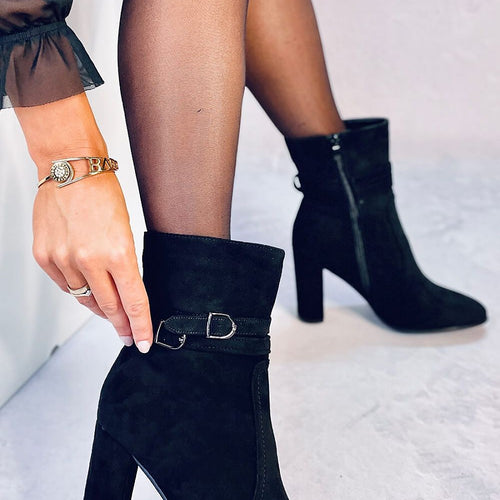 Classic women's boots with a heel height of 10 cm. The neat cut with gently rounded noses and subtle buckles looks exceptional.... Practical zipper closure on the side of the upper is also their advantage. They are made of eco-suede, and the interior is lined with soft fur. fabric ecological suede warmers soft fur Heel height 10 cm Size Insole...