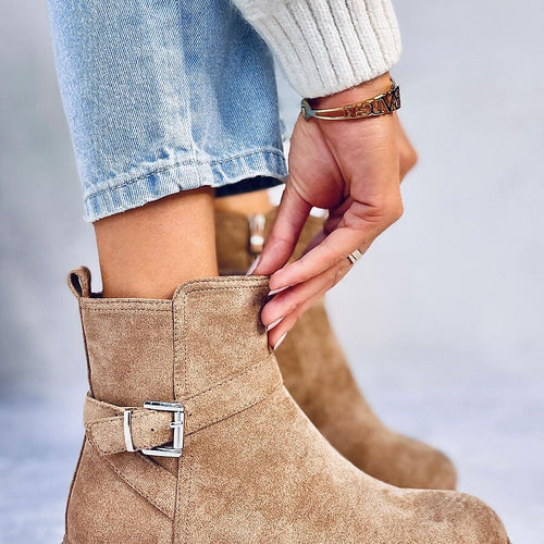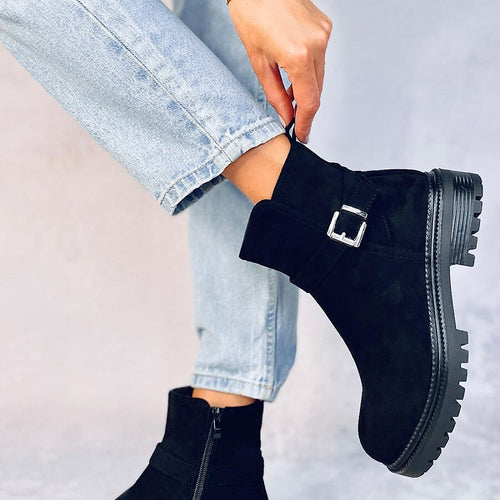 Suede booties - slingbacks on a protector. They have a timeless cut with rounded toes and a practical zipper closure. A delicate buckle adds variety to the upper and gives them a unique style. They are made of eco-suede, and the interior is lined with soft fur. fabric ecological suede warmers soft fur Heel height 3,5 cm Platform height 1,5...