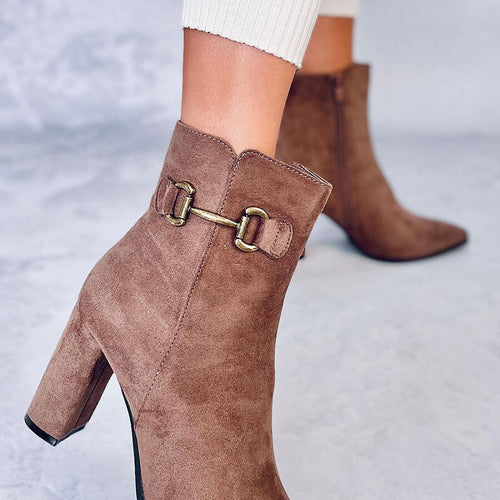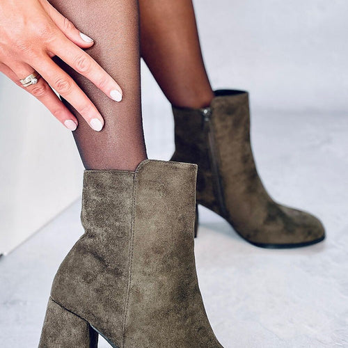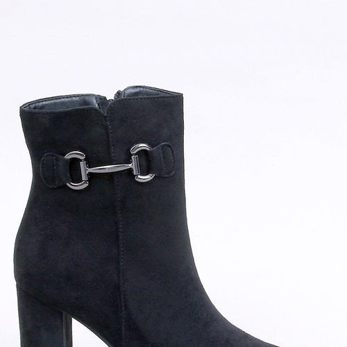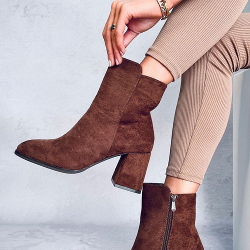 Women's suede boots on a post. Feminine and graceful cut of this model is complemented by tapered nose and a straight heel of 9 cm height, which will slenderize your figure : ) A subtle buckle on the side of the upper makes the shoes even more special.... Wearing comfort is provided by a practical zipper closure on the side...