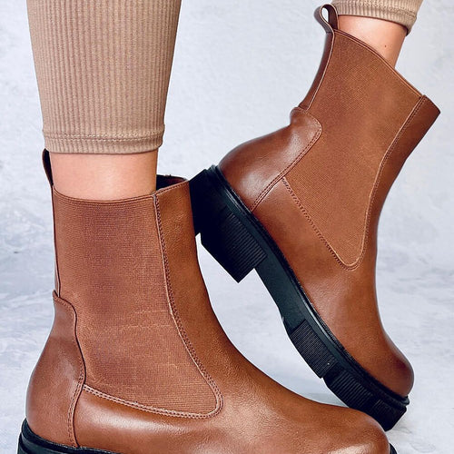 Women's veneer boots ? Lace-up slippers on a thick sole. This model is distinguished by a minimalist cut with rounded toes. Comfort and fit to the leg will be taken care of by elastic side inserts. This is a must-have model in every woman's closet : ) They are made of ecological leather, on a foam lining. fabric artificial leather...