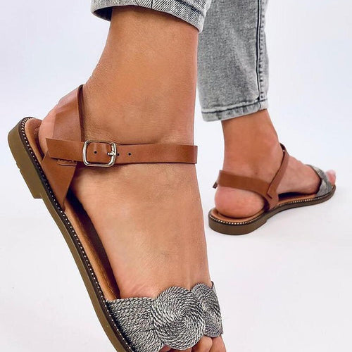 Flat women's sandals. The flat sole provides comfort with every step, and the adjustable ankle strap ensures optimal fit and enhances its beauty. The eye-catching features include a stylish woven strap and decorative trim... The outer material is eco-leather + fabric. fabric leatherette + fabric Size Insole lenght 36 23,5 cm 37 24 cm 38 24,7 cm 39 25,5 cm...