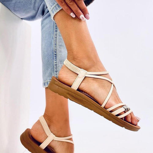 Women's sandals with a slight 2.5 cm heel. They have a minimalist design with gold details and crisscrossing straps that beautifully accentuate the arch of the foot... Flat sandals are a perfect choice for women who value comfort... Outer material: faux leather. fabric artificial leather Sole height 2,5 cm Size Insole lenght 36 23,3 cm 37 24 cm 38 24,5...
