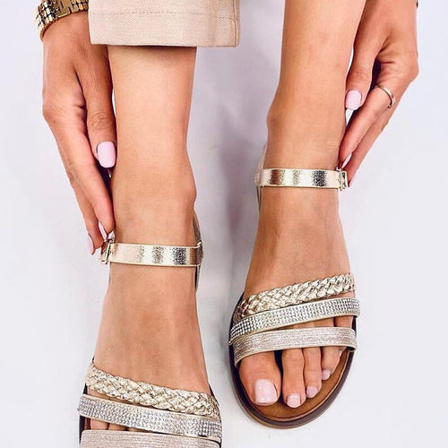 Metallic flat-heeled women's sandals. The model stands out with a shiny application of small stones and a beautifully shimmering finish - they look stunning on the foot! The sandals also have an adjustable fastening that accentuates the ankle... Perfect for the summer time to create unforgettable holiday outfits :) External material - synthetic leather. fabric artificial leather Size Insole lenght...