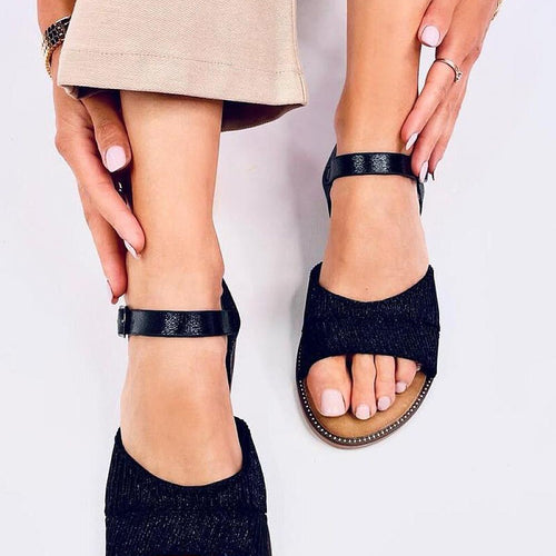 Flat women's sandals. Their unique finish beautifully accentuates the foot - see for yourself how exceptional you will look in them :) The adjustable closure ensures a proper fit, while the flat sole guarantees comfort with every step. Are you ready for summer days? :) Outer material - synthetic leather + fabric. fabric leatherette + fabric Size Insole lenght 36...
