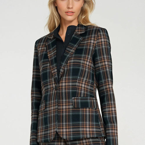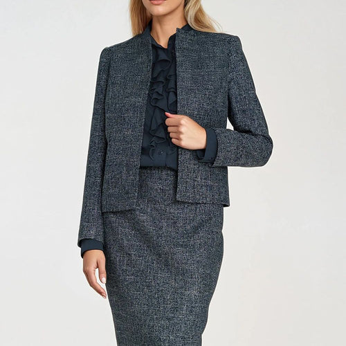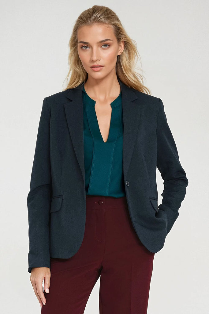 An elegant women's jacket with a slim fit, tailored to the silhouette, is the perfect choice for women who appreciate classic style with a modern twist. The model has a collar with classic lapels, long sleeves, and sewn-in shoulder pads that subtly shape the silhouette. The jacket is hip-length and fastens with one button, emphasizing the tailored fit. There are...