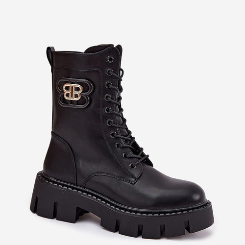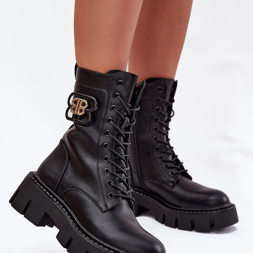 Women's workery boots made of eco leather. Set on a platform with a flat heel, they provide stability and comfort when worn. The model, fastened with a zipper and additionally laced, guarantees a perfect fit to the foot. Their character is enhanced by a decorative strap with the letter W and a buckle, which emphasizes their modern, stylish look. Perfect...