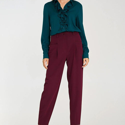 Elegant women's trousers with a fit cut, tailored to the silhouette, made of high-quality material that ensures comfort when worn. The model has a medium waist and a tapered leg that narrows towards the bottom, finished with a subtle side slit that adds a modern character. The trousers have pressed creases on the front and back, which emphasize the elegant,...