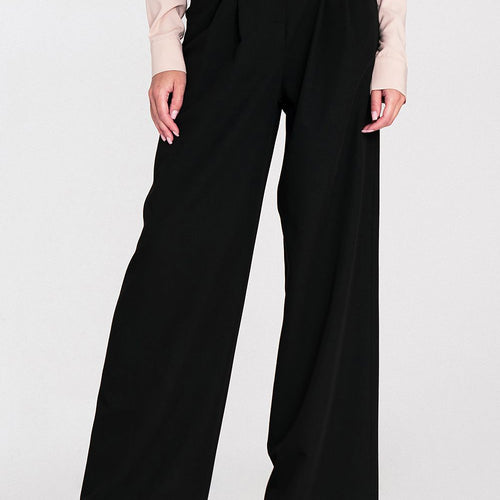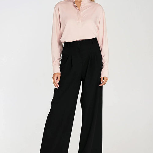 Elegant women's trousers with a loose relaxed fit and high waist, which beautifully emphasize the waist and visually elongate the legs. The model features decorative pleats at the front and wide, long wide leg trousers, giving the silhouette lightness and freedom. The trousers have a zip and button fastening at the front, classic side pockets and faux back pockets, adding...