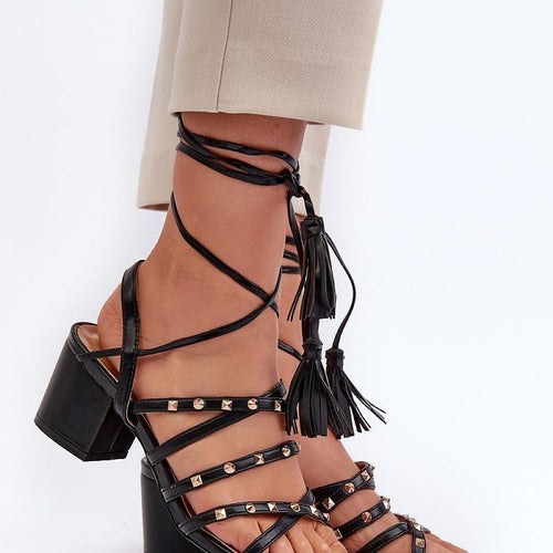 Stylish women's sandals made of eco leather. The front features interlacing straps adorned with studs. The model is lace-up. Perfect for summer days, these sandals will be a perfect addition to your summer wardrobe, adding a touch of style and originality. fabric artificial leather Footbed artificial leather Heel height 6.5 cm Size Insole lenght 36 23 cm 37 23.5 cm...
