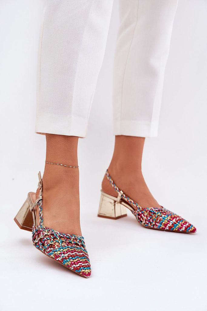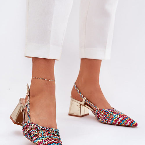 Women's sandals made of braided material, set on a pillar-type heel. Pointed toes give a subtle elegance, and buckle fastening allows for a perfect fit. The soft eco-leather insole provides comfort throughout the day. These sandals will be a perfect choice for summer days, matching well with dresses, skirts, or pants, adding a unique character to any outfit. fabric plastic...