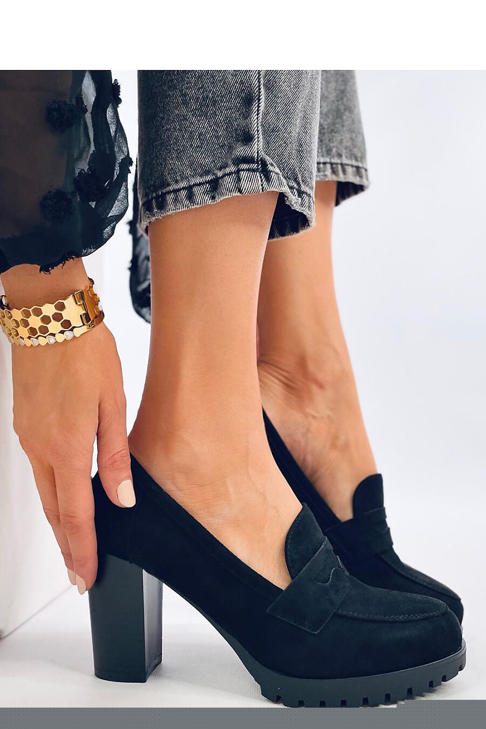 Women's suede moccasins. They have a sleek cut with rounded toes and a black color that matches everything. The heel - a 9 cm high post will slenderize the silhouette, and the platform (1 cm) on the trapper will additionally ensure stability. If you want to look special then you must have them : ) Outer material ? ecological suede.