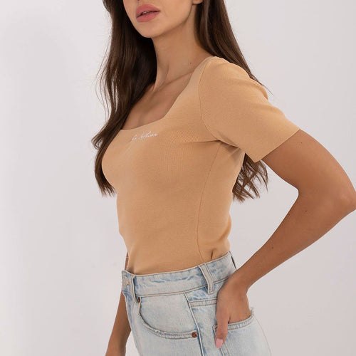 This fitted shirt made of elastic, ribbed material is the perfect choice for women who appreciate minimalism and comfort in their everyday life. Made of polyamide, it fits nicely to the body, emphasizing the silhouette, while providing comfort and freedom of movement. The square neckline adds a modern character to it, and the short sleeve makes the shirt perfect for...