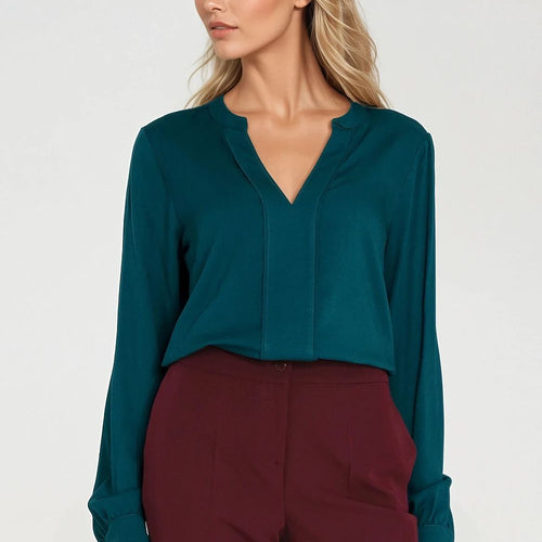 Classic women's blouse with a regular cut, made of light and breathable viscose. The model has a V-neck with a wide pleat, which visually slims the silhouette and adds elegance to the whole outfit. The blouse has long sleeves with cuffs and is put on over the head, which ensures comfort when wearing. The simple, timeless cut makes it perfect...