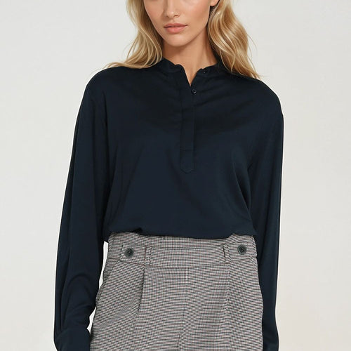 The modern oversized women's blouse is a combination of freedom and elegance. Made of lightweight and pleasant to the touch viscose, it ensures comfort throughout the day. The model has a polo neckline with a stand-up collar and long sleeves with cuffs, giving the whole a classic character. The blouse is buttoned halfway with a covered placket, emphasizing its minimalist...