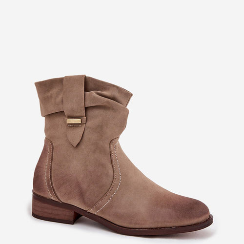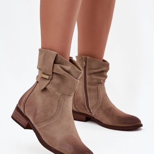 Women's ankle boots made of soft eco suede. The model set on a low heel provides wearing comfort, and the insulated interior is perfect for colder days. The zipper makes it easy to put on and take off shoes, while the rounded toes give them a classic character. Charm is added by the gathered upper, which emphasizes a stylish, feminine...
