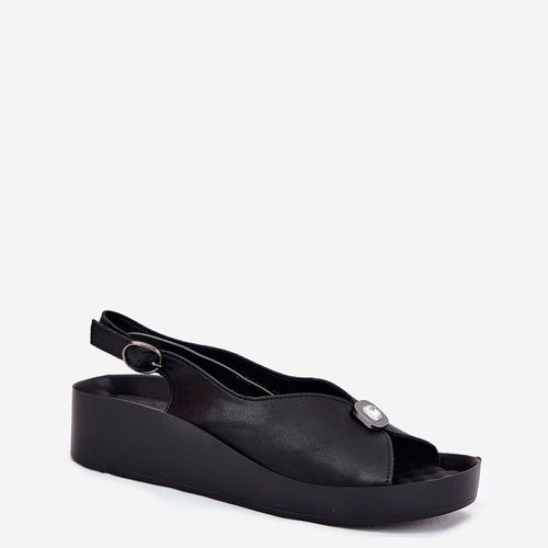 Women's sandals from the S.Barski brand. Made of natural leather. Set on a delicate wedge heel, they provide comfort and stability throughout the day. There is a decoration at the front that gives them a unique character. The soft insole increases wearing comfort, and the buckle closure with an adjustable strap allows for a perfect fit to the foot. Perfect...