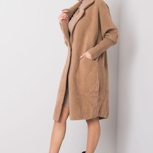 Women's long sleeve coat with press stud fastening. Coat with large slip pockets. ~Angora 15.3 % Polyester 23.5 % Viscose 22.8 % wool 38.4 % Size Total length Chest one-size-fits-all 86 cm 134 cm