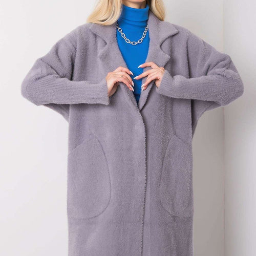 Women's coat with long sleeves, fastened with press studs. The coat has slip pockets. The coat does not have a lining. ~Angora 15.3 % Polyester 23.5 % Viscose 22.8 % wool 38.4 % Size Total length Chest one-size-fits-all 92 cm 124 cm