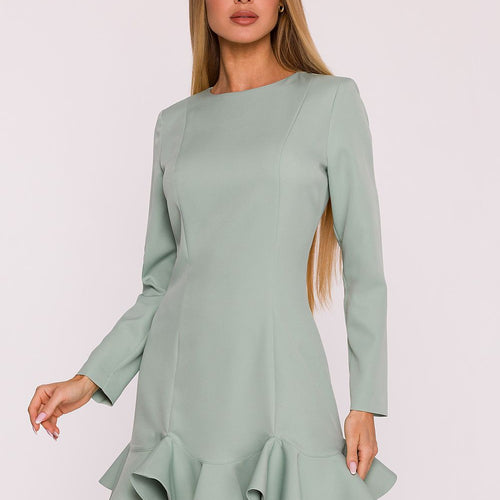 Subtle and feminine dress made of smooth fabric with a matte finish is a perfect choice for many occasions. The simple form has been enhanced with a fancy ruffle at the bottom, which gives the whole dress lightness and girlish charm. The model features a classic, semi-round neckline and long sleeves, making it look elegant and timeless. The hidden zipper...