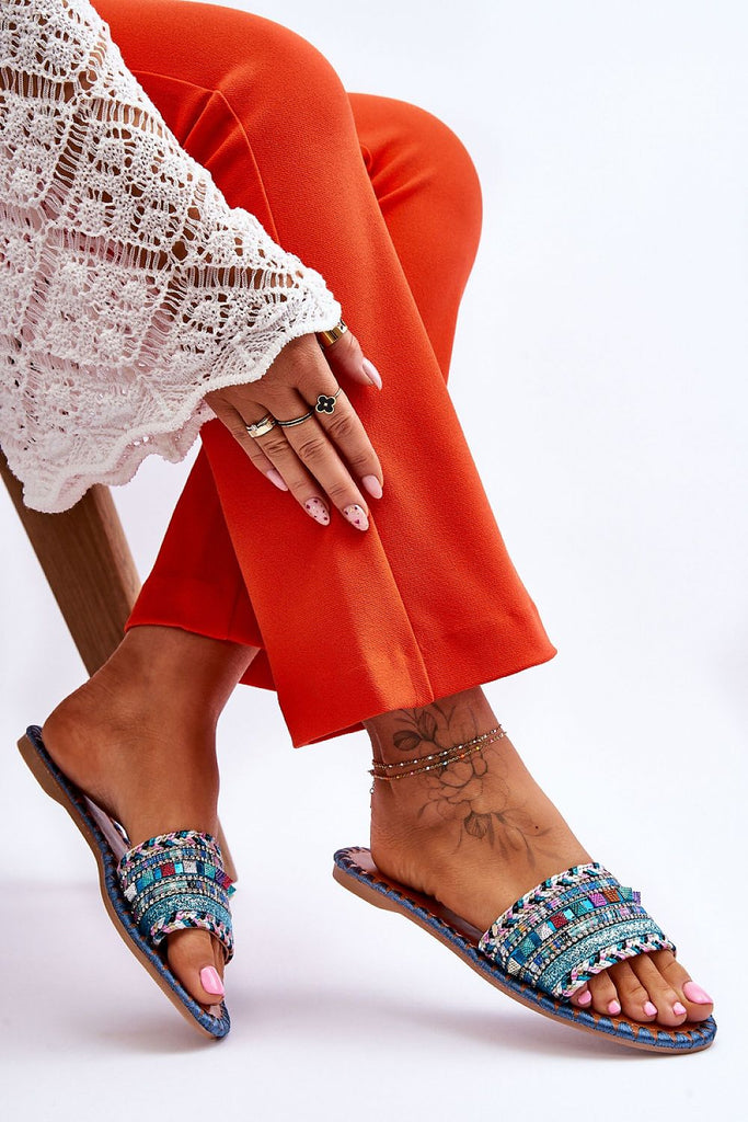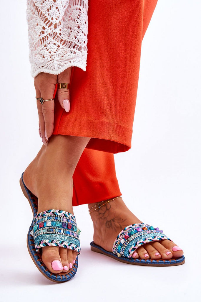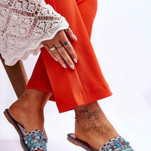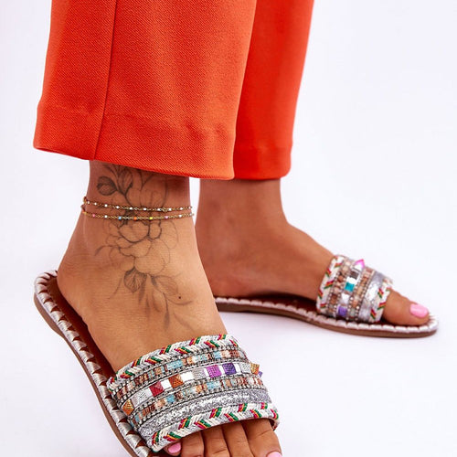 Unique women's flip-flops with decorations on the front. Made of a combination of fabric and plastic on top. Decorations in the form of rhinestones, studs, glitter and braided fabric distinguish this footwear from other flip-flops. The insole made of eco leather was also decorated with thread. The flip-flops are set on a flat heel with a non-slip sole. fabric ~tkanina...