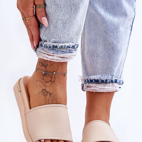 Classic flip-flops by Big Star are made of eco leather. This model has a slightly raised nose and a plastic platform. There is a logo on the top and on the insole. In addition, the back part was decorated with a mirror element. You should definitely have them! fabric artificial leather Footbed ~tworzywo sztuczne Heel height 4 cm Platform height...