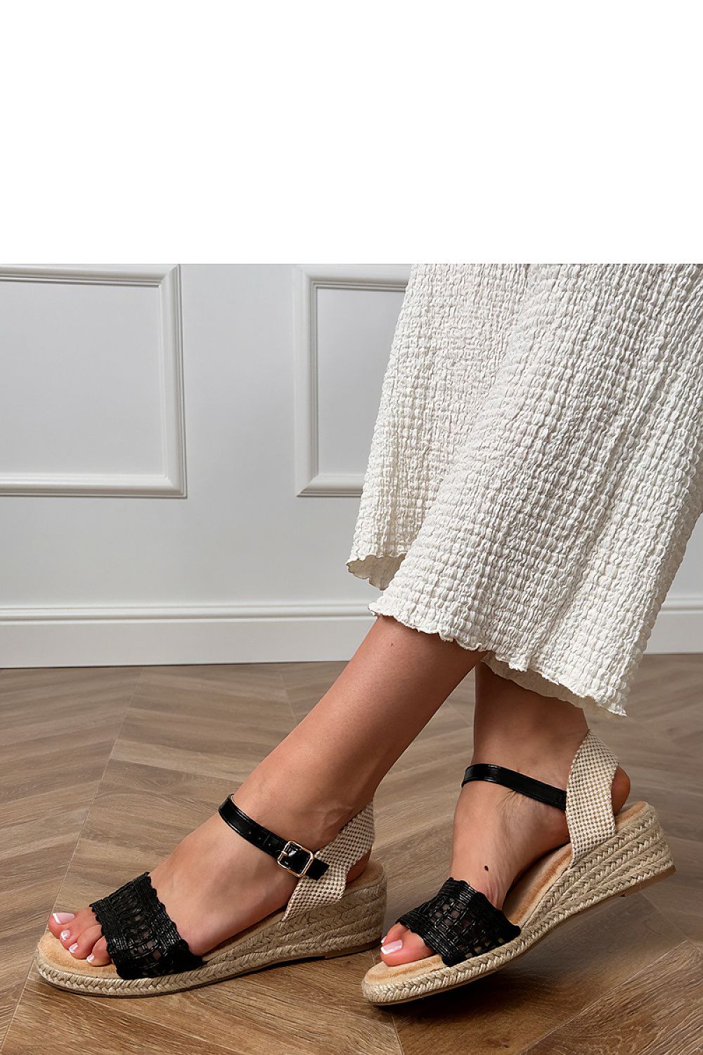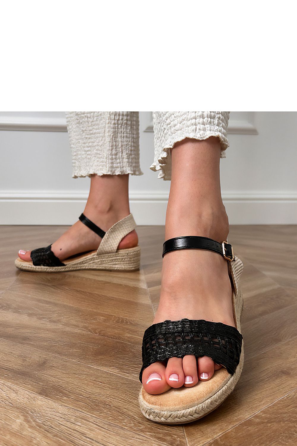 Wedge sandals are a stylish and comfortable choice for warm days. Made of lightweight fabric, they look subtly and feminine, fitting perfectly into summer stylizations. The interior lined with suede-like eco leather provides comfort for wearing, even for many hours. The 5 cm wedge gently lifts the silhouette, without sacrificing comfort. The model fastens with a buckle, allowing for a perfect fit to the foot. The classic patternless design makes the sandals versatile and easy to match with various wardrobe items.