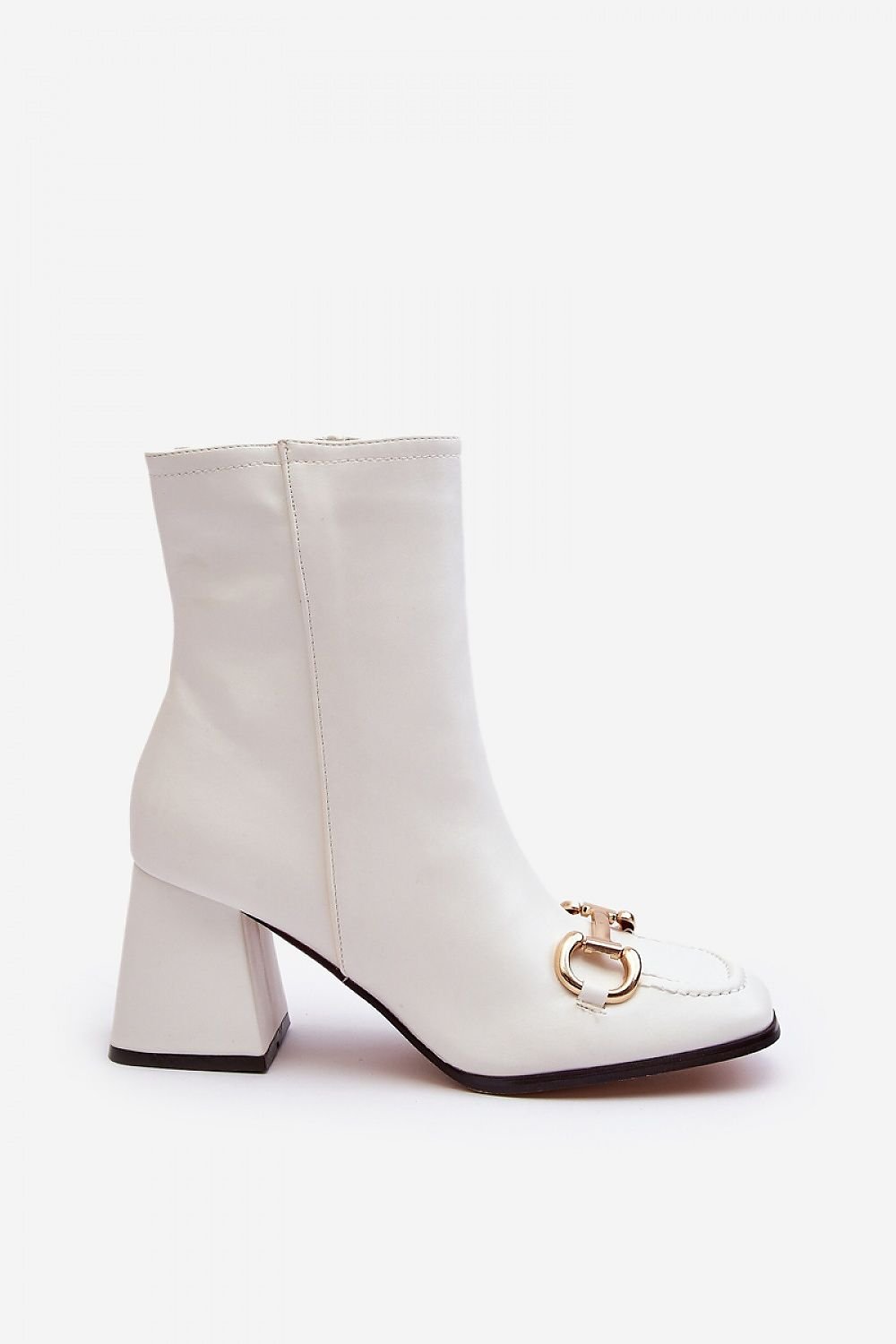 Women's boots were made of eco leather. Fastened with a zipper on the side. Heel in the form of a block. On the front there is a gold ornament made of plastic. The heel counter is stiffened, the noses are square. This model should find a place in your closet!