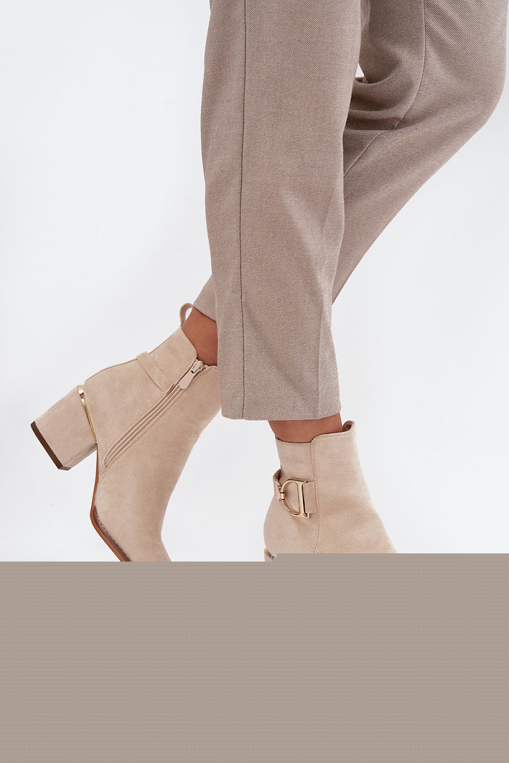 Women's ankle boots made of eco suede. Set on a column-shaped heel. Rounded toes give them a subtle, feminine character, and the zipper makes them easy to put on. The interior is lined with soft shoe lining for warmth and comfort, and the golden elements add a stylish, elegant accent that complements both everyday and more formal outfits.