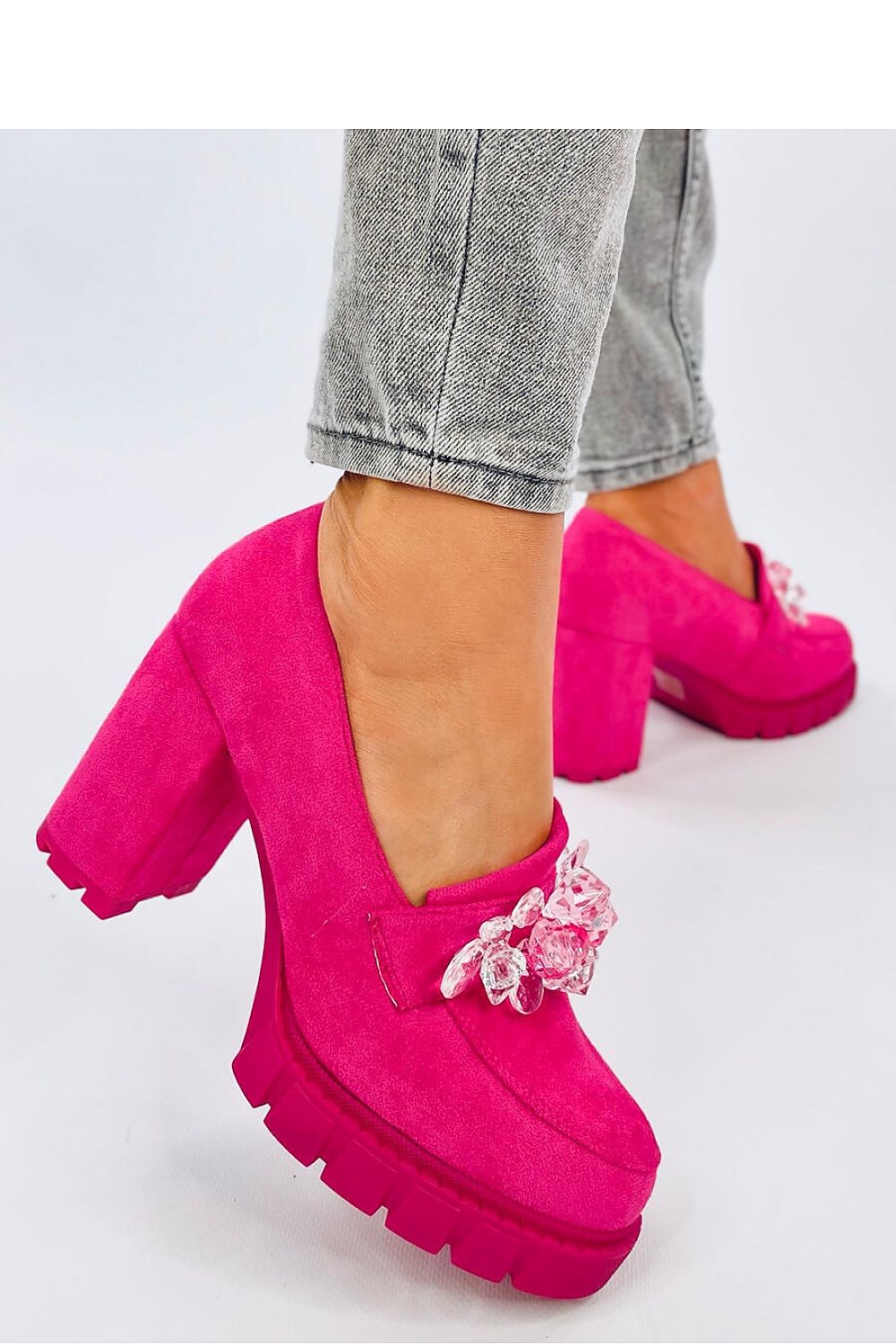 Women's moccasins with a heel height of 8,5 cm and a platform of 2 cm. The most fashionable application of sparkling crystals will attract all eyes : ) While the soft insole will provide comfort on every step. If you follow the trends then you must have them! Outer material ? eco-suede (color fuchsia, black)/ fabric (color blue).
